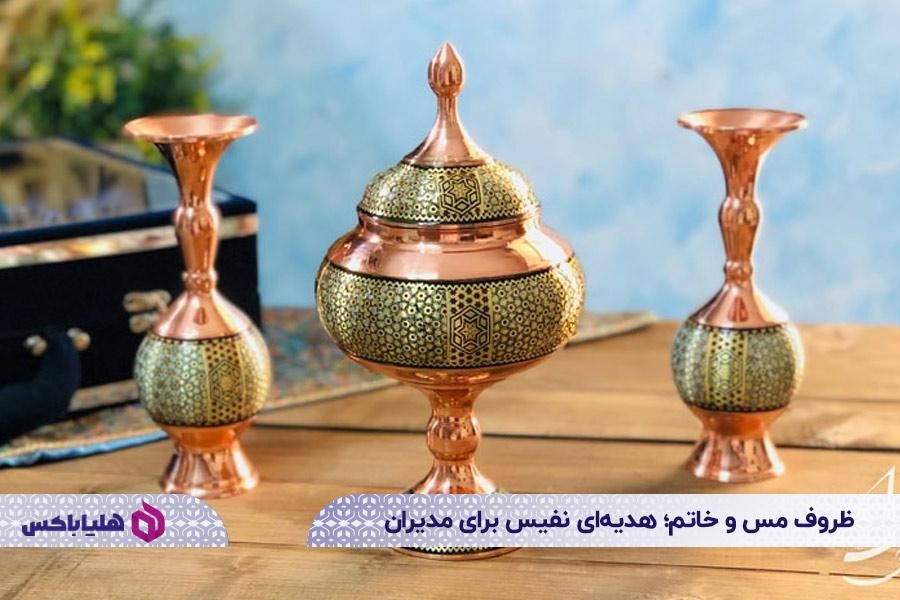 یکی از گزینههای ممتاز برای هدیه رسمی به مدیران، ظروف مس و خاتم اصفهان است. این ظروف ترکیبی از هنر سنتی و طراحی مدرن هستند و جلوهای فاخر و ماندگار به محیط کاری میبخشند. انتخاب چنین هدیهای، نشاندهنده سلیقه هوشمندانه و احترام شما به جایگاه مدیر است و همزمان ارزش فرهنگی و هنری بالایی دارد. برای خرید چنین هدیهای موارد زیر را در نظر داشته باشید:
