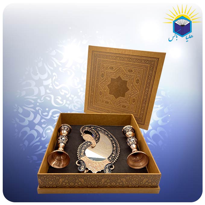 صنايع دستی اصفهان در طول قرن‌های متمادی به‌عنوان نماينده هنر اصيل قوم ايرانی در جهان معرفی شده‌اند و یکی از بهترین سوغاتی‌های این شهر به شمار می‌آیند. ظروف قلم تراش یا حکاکی روی مس با زیرساخت مسی هستند که به دلیل خمش پذیری عالی، جلوه زیبای نقوش و ماندگاری بالای آن است. به همین دلیل در صورت نگهداری صحیح، این ظروف تا سالیان طولانی زیبایی خود را حفظ خواهند کرد.در ساخت انواع ظروف الماس تراش از دو نوع رنگ بندی کلی، فرمولاسیون سرمه ای و فیروزه ای استفاده می کنند. اما پاشش رنگی در این ظروف با ظروف میناکاری متفاوت است به همین دلیل فروش ظروف الماس تراش مورد توجه بسیاری از فروشندگان صنایع دستی قرار گرفته است. این آینه بته جقه ۲۵ سانت وجفت شمعدان کوچک مس و الماس تراش دارای جعبه هدیه از جنس ام دی اف و چرم که در مجموع به وزن ۲ کیلو گرم است. ابعاد آینه ۲۵ * ۱۶ و ابعاد شمعدان ۱۷ * ۷ و ابعاد داخلی جعبه ۳۱.۵ * ۳۱.۵ * ۶ میباشد.
