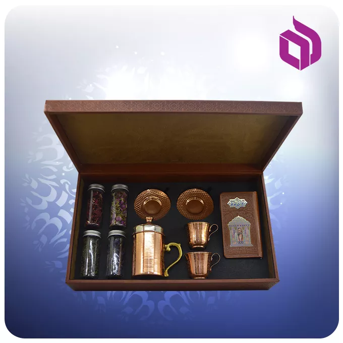 این ست نفیس شامل یک جلد دیوان حافظ در قطع پالتویی است که به راحتی قابل حمل بوده و همواره همراه شما خواهد بود. قلب این مجموعه، ست پذیرایی مسی دستساز آن است. اجزای مسی شامل یک فنجان و نعلبکی و یک لیوان دمنوش مجزا است که تمامی آنها با هنر ظریف مسگری و چکشکاری خلق شدهاند. استفاده از مس نه تنها به دلیل زیبایی چشمنواز و براقیت طبیعیاش است، بلکه خواص سلامتیبخش فلز مس نیز به ارزش کاربردی این دمنوشخوری میافزاید. ابعاد متناسب ظروف مسی (مانند لیوان دمنوش ۱۴ سانتیمتری) در کنار بستهبندی شکیل و مستحکم جعبه، محافظی درخور برای این کالای ارزشمند است و آن را آماده ارائه میکند. تکنیکهای ساخت سنتی به کار رفته در این ظروف، هر قطعه را به یک اثر هنری منحصر به فرد تبدیل کرده است.