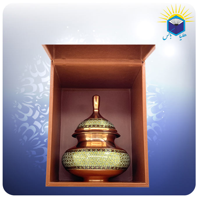 صنایع دستی اصفهان قرنهاست که بهعنوان نماد هنر و فرهنگ اصیل ایرانی در جهان میدرخشند و بهترین گزینه برای سوغات به شمار میروند. در میان این آثار، هنر ترکیبی مس و خاتم جایگاه ویژهای دارد که حاصل همکاری هنرمندانه مسگران و خاتمکاران است. در فرآیند ساخت این شاهکار، ابتدا بدنه ظرف مسی توسط استادکاران مسگری با ظرافت شکل میگیرد و سپس با قطعات چوب و استخوان که به صورت نقوش هندسی ظریف کنار هم چیده شدهاند، تزئین میگردد. این دخل کوچک مس و خاتمکاری ۱۸ سانت آقاجانی با وزن ۱.۲۷ کیلوگرم، دارای ابعاد ۱۸ در ۱۴ سانتیمتر است و درون یک جعبه امدیاف روکش چرمی با ابعاد داخلی ۲۱ در ۱۶ در ۱۲ سانتیمتر قرار دارد که از آن محافظت کرده و در عین حال بهعنوان یک بستهبندی هدیهای شیک و خاص عمل میکند.