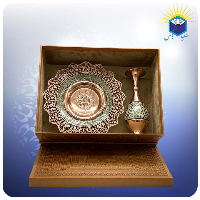 این محصول یک ست دو تکه و کاربردی از هنر خاتمکاری است که شامل یک ظرف شیرینیخوری و یک گلدان صراحی میباشد. این مجموعه با هدف ایجاد یک چیدمان هماهنگ و اصیل بر روی میزهای پذیرایی طراحی شده و هر دو قطعه در یک جعبه مشترک با روکش چرمی ارائه میشوند.