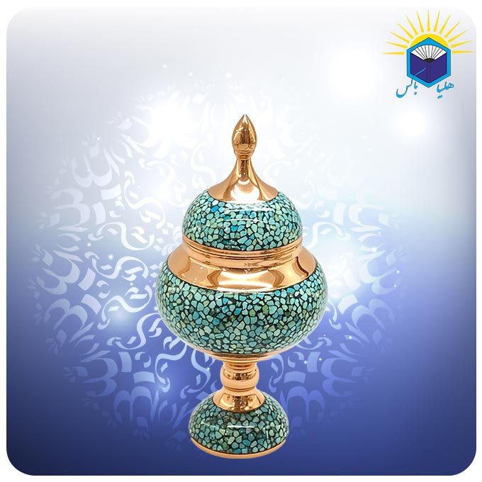 در هنر فیروزهکوبی، سطح ظروف و اشیای تزیینی که از فلزاتی مانند مس، برنج، نقره یا برنز ساخته شدهاند، با قطعات بسیار ریز سنگ فیروزه آراسته میشود. این قطعات با دقت بالا و به کمک ابزار مخصوص روی سطح ظرف مسی قرار گرفته و با استفاده از چسب فیروزهکوبی یا لاک گردویی محکم میشوند. هرچه فاصله میان قطعات فیروزه کمتر باشد و رنگ چسب در سطح کار دیده نشود، ارزش هنری و کیفیت نهایی اثر بالاتر خواهد بود.