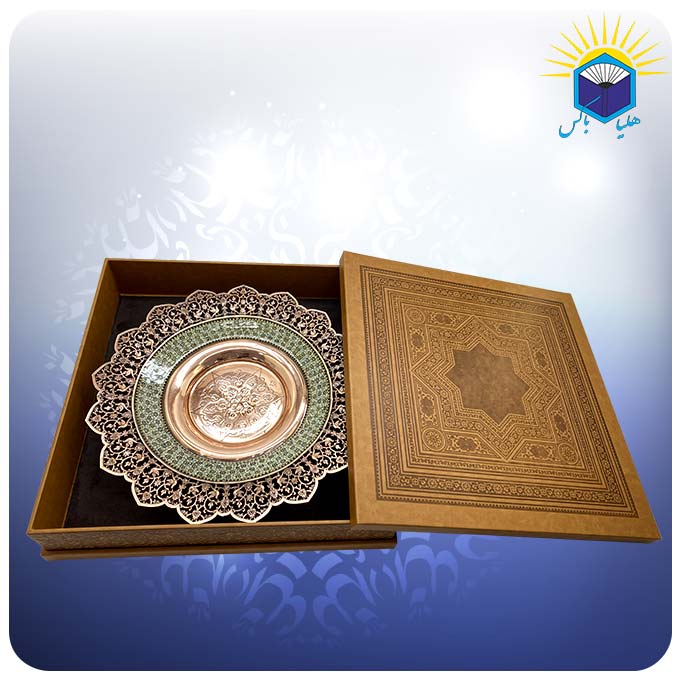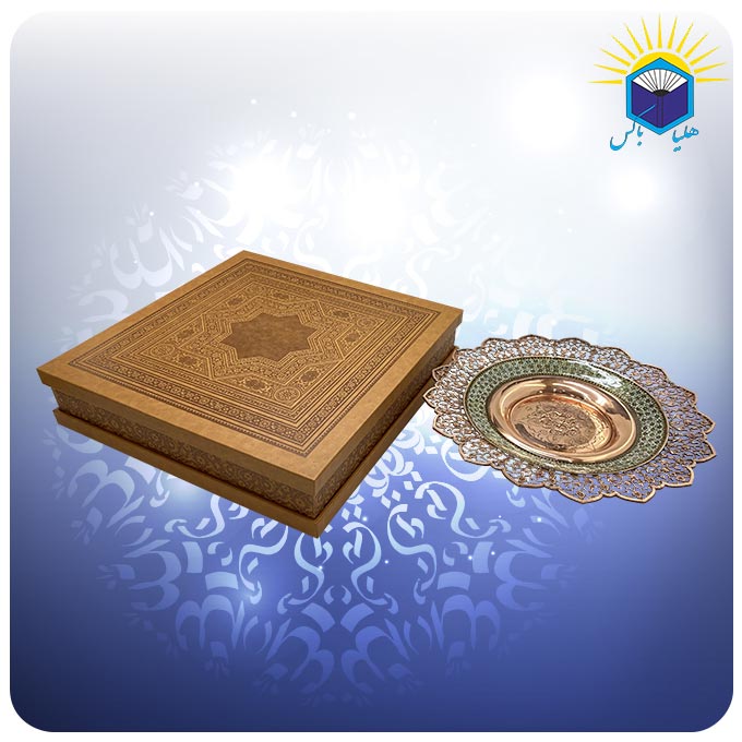 صنايع دستی اصفهان در طول قرنهای متمادی بهعنوان نماينده هنر اصيل قوم ايرانی در جهان معرفی شدهاند و یکی از بهترین سوغاتیهای این شهر به شمار میآیند. مس و خاتم یکی از صنایع دستی نسبتا جدید اصفهان است که از تلفیق هنر مسگری و خاتم سازی به وجود آمده است. در خاتم کاری از چوب و استخوان استفاده میشود و تمام سطح جسم موردنظر را با نقوش هندسی پر میکنند. برای خاتم کاری روی مس در ابتدا ظرف مسی موردنظر توسط استاد مسگر آماده شده و سپس بخشهایی از آن با قطعات خاتم کاری پوشانده میشود. این شیرینی خوری مس و خاتم کاری ۳۰ سانت دارای جعبه هدیه از جنس ام دی اف و چرم به وزن ۱.۸۳ گرم است. ابعاد داخلی جعبه ۳۱.۵ * ۳۱.۵ * ۶ میباشد.