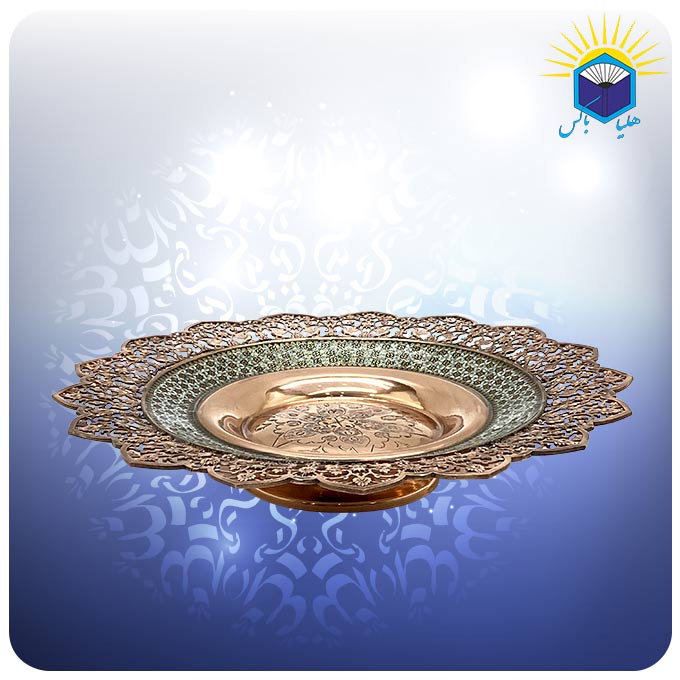 صنايع دستی اصفهان در طول قرنهای متمادی بهعنوان نماينده هنر اصيل قوم ايرانی در جهان معرفی شدهاند و یکی از بهترین سوغاتیهای این شهر به شمار میآیند. مس و خاتم یکی از صنایع دستی نسبتا جدید اصفهان است که از تلفیق هنر مسگری و خاتم سازی به وجود آمده است. در خاتم کاری از چوب و استخوان استفاده میشود و تمام سطح جسم موردنظر را با نقوش هندسی پر میکنند. برای خاتم کاری روی مس در ابتدا ظرف مسی موردنظر توسط استاد مسگر آماده شده و سپس بخشهایی از آن با قطعات خاتم کاری پوشانده میشود. این شیرینی خوری مس و خاتم کاری ۳۰ سانت به وزن ۵۵۰ گرم میباشد.