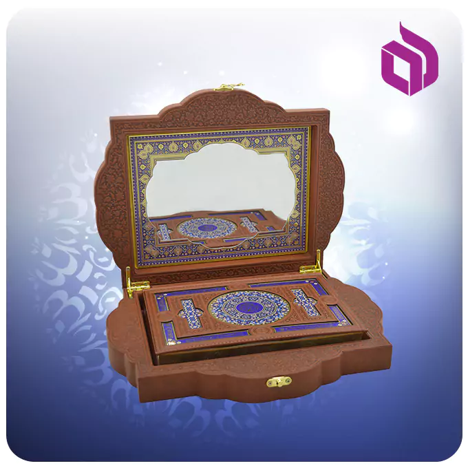 قرآن وزیری جعبه‌دار چرم (طرح صدف با آینه پلاک‌دار) نسخه‌ای نفیس از قرآن کریم است که با ظاهری فاخر و ساختی باکیفیت، ترکیبی از هنر اسلامی و کاربردی‌گری را ارائه می‌دهد. این اثر با قطع وزیری طراحی شده تا تجربه‌ای متعادل از اندازه‌ی مطلوب برای کتابت و حفظ اصالت به کاربر بدهد، به‌گونه‌ای که هم در استفاده روزمره و هم در نمایش در کتابخانه جلوه‌ی باوقاری دارد.