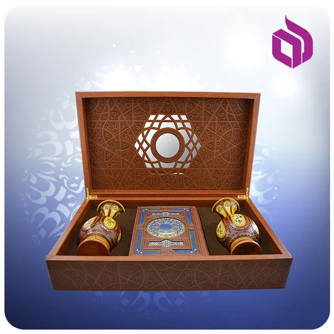حضور ترجمه روان و ماندگار مهدی الهی قمشهای، این اثر را از نظر ادبی و محتوایی به کمال رسانده است. کل مجموعه در یک جعبه نفیس با طراحی «لپتاپی» قرار گرفته که ایمنی و زیبایی محصول را تضمین میکند. همچنین، همراهی گلدانهای هنری، این پکیج را به یک بسته فرهنگی کامل تبدیل کرده است که هنر نساجی و طراحی سنتی ایران را به زیباترین شکل ممکن به نمایش میگذارد و جلوهای تجملی به آن میبخشد.