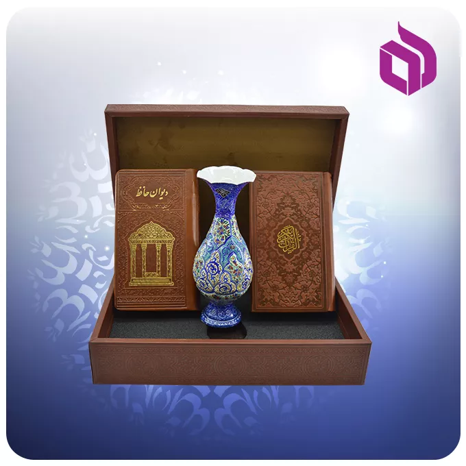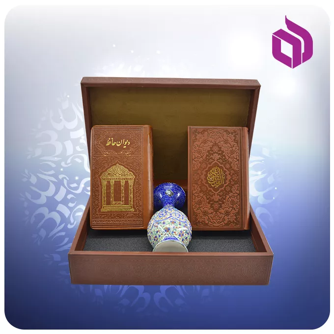 این مجموعه شامل دو کتاب قرآن کریم و دیوان حافظ با صحافی پالتویی است که در جعبهای شکیل با روکش چرم قرار گرفتهاند. ابعاد کلی ست ۲۶ × ۱۹ × ۷.۵ سانتیمتر است و با توجه به طراحی جمعوجور، بهراحتی در فضاهای مختلف قابل نگهداری است. در کنار کتابها، یک گلدان میناکاری ۱۶ سانتیمتری قرار دارد که روی بدنه مسی اجرا شده و با ترکیب رنگهای لاجوردی و فیروزهای، جلوه هنری مجموعه را کامل میکند. وزن ۱.۳۱ کیلوگرمی این ست نیز نشاندهنده کیفیت ساخت و متریال بهکاررفته در آن است.