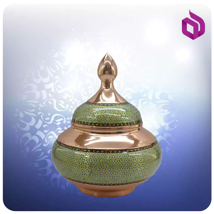 صنايع دستی اصفهان در طول قرنهای متمادی بهعنوان نماينده هنر اصيل قوم ايرانی در جهان معرفی شدهاند و یکی از بهترین سوغاتیهای این شهر به شمار میآیند. مس و خاتم یکی از صنایع دستی نسبتا جدید اصفهان است که از تلفیق هنر مسگری و خاتم سازی به وجود آمده است. در خاتم کاری از چوب و استخوان استفاده میشود و تمام سطح جسم موردنظر را با نقوش هندسی پر میکنند. برای خاتم کاری روی مس در ابتدا ظرف مسی موردنظر توسط استاد مسگر آماده شده و سپس بخشهایی از آن با قطعات خاتم کاری پوشانده میشود. این قندان بزرگ مس و خاتم کاری ۲۵ سانت آقا جانی به وزن ۸۳۰ گرم میباشد.