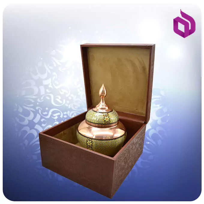 صنايع دستی اصفهان در طول قرنهای متمادی بهعنوان نماينده هنر اصيل قوم ايرانی در جهان معرفی شدهاند و یکی از بهترین سوغاتیهای این شهر به شمار میآیند. مس و خاتم یکی از صنایع دستی نسبتا جدید اصفهان است که از تلفیق هنر مسگری و خاتم سازی به وجود آمده است. در خاتم کاری از چوب و استخوان استفاده میشود و تمام سطح جسم موردنظر را با نقوش هندسی پر میکنند. برای خاتم کاری روی مس در ابتدا ظرف مسی موردنظر توسط استاد مسگر آماده شده و سپس بخشهایی از آن با قطعات خاتم کاری پوشانده میشود. این قندان سیبی مس و خاتم کاری شالدار ۲۷ سانت دارای جعبه هدیه از جنس ام دی اف و چرم به وزن ۲.۰۶ کیلو گرم است. ابعاد قندان ۲۷ * ۱۸ وابعاد داخلی جعبه ۲۵ * ۲۴.۵ * ۱۲ میباشد.