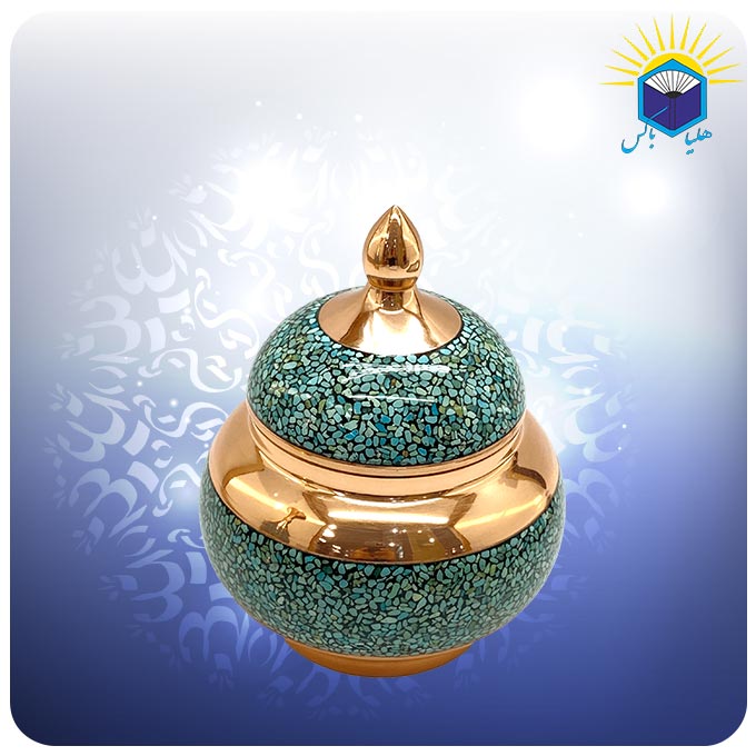 صنايع دستی اصفهان در طول قرنهای متمادی بهعنوان نماينده هنر اصيل قوم ايرانی در جهان معرفی شدهاند و یکی از بهترین سوغاتیهای این شهر به شمار میآیند. در اصفهان فیروزه کوبی روی جواهرات و همچنین در ظروفی مانند گلدان، سنبلدان، شمعدان، قندان، شکلات خوری، شیرینی خوری، میوه خوری، آجیل خوری، سنگاب، شربت خوری، تنگ، آینه، کشکول و غیره انجام میشود. رنگ ظرفهای فیروزه کوبی عموما آبی و سبز است. در هنر فیروزه کوبی ظرفها، زیورآلات و اشیای تزیینی (از جنس مس، برنج، نقره یا برنز) با استفاده از سنگهای فیروزه در قطعات بسیار کوچک آراسته میشوند. برای این کار قطعات ریز فیروزه را با استفاده از ابزار و وسایل فیروزه کاری روی ظروف مسی قرار میدهند و با استفاده از چسب فیروزه کوبی یا لاک گردویی آنها را محکم میکنند. ارزش هنری کار زمانی بیشتر است که فاصله بین قطعات فیروزه کمتر باشد و رنگ چسب در کار مشخص نشود. این قندان کوچک مس و فیروزه کوب ۱۱ سانت آقاجانی به وزن ۲۲۰ گرم میباشد.