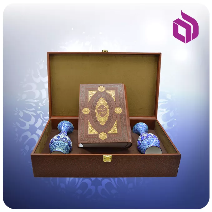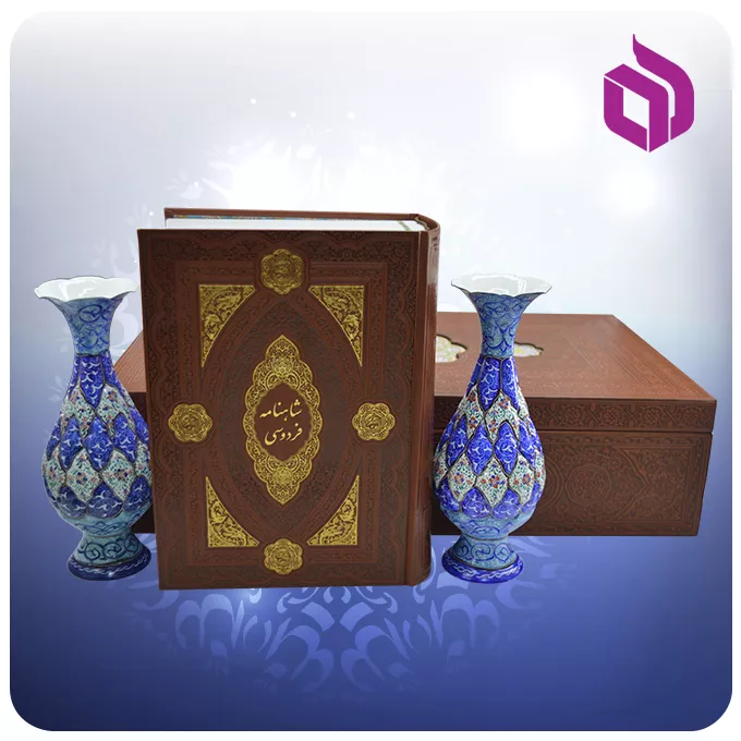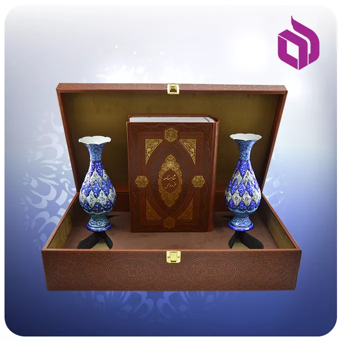 این مجموعه شامل یک جلد کلیات شاهنامه فردوسی در قطع وزیری است که در کنار دو گلدان میناکاری با ارتفاع ۲۰ سانتیمتر قرار گرفتهاند. همه اجزا داخل یک جعبه نفیس از جنس MDF با روکش چرم چیدمان شدهاند که ابعاد ۴۵.۵ × ۲۷.۵ × ۱۱ سانتیمتر و وزن ۴.۰۸ کیلوگرم دارد. طراحی لپتاپی جعبه، حمل و استفاده از آن را آسانتر کرده است و در عین حال از محتویات مجموعه بهخوبی محافظت میکند. گلدانهای مسی نیز با دقت میناکاری شدهاند و جلوه هنری این ست را کاملتر میکنند.