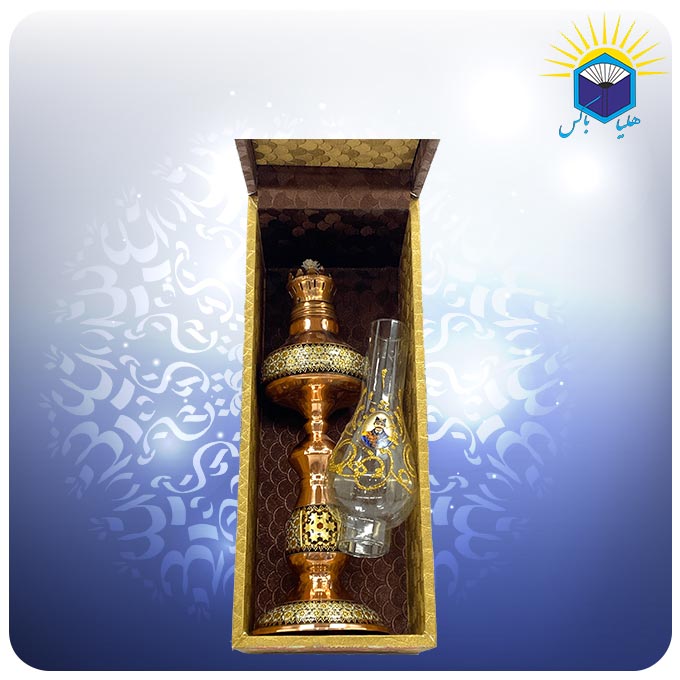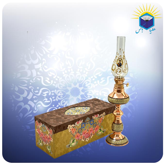 صنايع دستی اصفهان در طول قرنهای متمادی بهعنوان نماينده هنر اصيل قوم ايرانی در جهان معرفی شدهاند و یکی از بهترین سوغاتیهای این شهر به شمار میآیند. مس و خاتم یکی از صنایع دستی نسبتا جدید اصفهان است که از تلفیق هنر مسگری و خاتم سازی به وجود آمده است. در خاتم کاری از چوب و استخوان استفاده میشود و تمام سطح جسم موردنظر را با نقوش هندسی پر میکنند. برای خاتم کاری روی مس در ابتدا ظرف مسی موردنظر توسط استاد مسگر آماده شده و سپس بخشهایی از آن با قطعات خاتم کاری پوشانده میشود. این چراغ نفتی مس و خاتم کاری شالدار دارای جعبه هدیه از جنس ام دی اف و گالینگور به وزن ۹۰۰ گرم است. ابعاد داخلی جعبه ۲۷ * ۱۰ * ۸.۵ میباشد.
