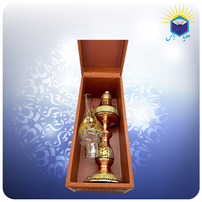 صنايع دستی اصفهان در طول قرنهای متمادی بهعنوان نماينده هنر اصيل قوم ايرانی در جهان معرفی شدهاند و یکی از بهترین سوغاتیهای این شهر به شمار میآیند. مس و خاتم یکی از صنایع دستی نسبتا جدید اصفهان است که از تلفیق هنر مسگری و خاتم سازی به وجود آمده است. در خاتم کاری از چوب و استخوان استفاده میشود و تمام سطح جسم موردنظر را با نقوش هندسی پر میکنند. برای خاتم کاری روی مس در ابتدا ظرف مسی موردنظر توسط استاد مسگر آماده شده و سپس بخشهایی از آن با قطعات خاتم کاری پوشانده میشود. این چراغ نفتی مس و خاتم کاری شالدار دارای جعبه هدیه از جنس ام دی اف و چرم به وزن ۹۰۰ گرم است. ابعاد داخلی جعبه ۲۷ * ۱۰ * ۸.۵ میباشد.