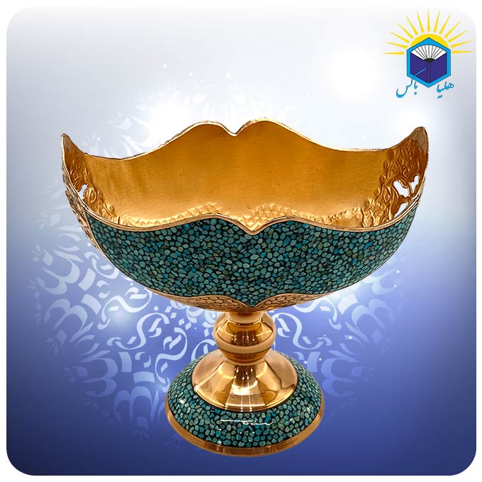 صنايع دستی اصفهان در طول قرنهای متمادی بهعنوان نماينده هنر اصيل قوم ايرانی در جهان معرفی شدهاند و یکی از بهترین سوغاتیهای این شهر به شمار میآیند. در اصفهان فیروزه کوبی روی جواهرات و همچنین در ظروفی مانند گلدان، سنبلدان، شمعدان، قندان، شکلات خوری، شیرینی خوری، میوه خوری، آجیل خوری، سنگاب، شربت خوری، تنگ، آینه، کشکول و غیره انجام میشود. رنگ ظرفهای فیروزه کوبی عموما آبی و سبز است. در هنر فیروزه کوبی ظرفها، زیورآلات و اشیای تزیینی (از جنس مس، برنج، نقره یا برنز) با استفاده از سنگهای فیروزه در قطعات بسیار کوچک آراسته میشوند. برای این کار قطعات ریز فیروزه را با استفاده از ابزار و وسایل فیروزه کاری روی ظروف مسی قرار میدهند و با استفاده از چسب فیروزه کوبی یا لاک گردویی آنها را محکم میکنند. ارزش هنری کار زمانی بیشتر است که فاصله بین قطعات فیروزه کمتر باشد و رنگ چسب در کار مشخص نشود. این کشکول شبکه مس و فیروزه کوب ۱۶ سانت به وزن ۵۷۰ گرم میباشد.