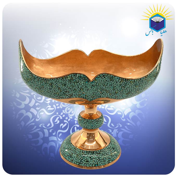 صنايع دستی اصفهان در طول قرنهای متمادی بهعنوان نماينده هنر اصيل قوم ايرانی در جهان معرفی شدهاند و یکی از بهترین سوغاتیهای این شهر به شمار میآیند. در اصفهان فیروزه کوبی روی جواهرات و همچنین در ظروفی مانند گلدان، سنبلدان، شمعدان، قندان، شکلات خوری، شیرینی خوری، میوه خوری، آجیل خوری، سنگاب، شربت خوری، تنگ، آینه، کشکول و غیره انجام میشود. رنگ ظرفهای فیروزه کوبی عموما آبی و سبز است. در هنر فیروزه کوبی ظرفها، زیورآلات و اشیای تزیینی (از جنس مس، برنج، نقره یا برنز) با استفاده از سنگهای فیروزه در قطعات بسیار کوچک آراسته میشوند. برای این کار قطعات ریز فیروزه را با استفاده از ابزار و وسایل فیروزه کاری روی ظروف مسی قرار میدهند و با استفاده از چسب فیروزه کوبی یا لاک گردویی آنها را محکم میکنند. ارزش هنری کار زمانی بیشتر است که فاصله بین قطعات فیروزه کمتر باشد و رنگ چسب در کار مشخص نشود. این کشکول مس و فیروزه کوب ۳۰ سانت به وزن ۱.۶۲ کیلو گرم میباشد.