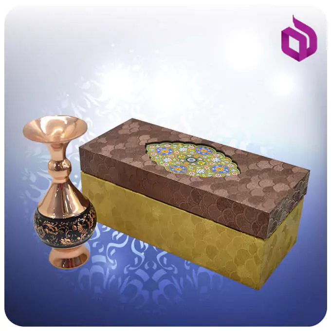 ویژگیهای این محصول عبارت است از یک گلدان با بدنه مسی و فرم پایدار تنه گرد، تزئین شده با هنر حکاکی دستی الماس تراش. ارتفاع گلدان ۱۳ سانتیمتر است. این محصول در یک جعبه مستحکم با ساختار MDF و روکش پارچهای گالینگور ارائه میگردد که برای آن طراحی شده است.