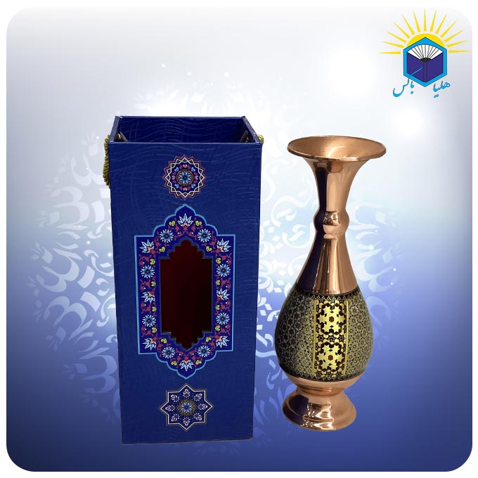صنايع دستی اصفهان در طول قرنهای متمادی بهعنوان نماينده هنر اصيل قوم ايرانی در جهان معرفی شدهاند و یکی از بهترین سوغاتیهای این شهر به شمار میآیند. مس و خاتم یکی از صنایع دستی نسبتا جدید اصفهان است که از تلفیق هنر مسگری و خاتم سازی به وجود آمده است. در خاتم کاری از چوب و استخوان استفاده میشود و تمام سطح جسم موردنظر را با نقوش هندسی پر میکنند. برای خاتم کاری روی مس در ابتدا ظرف مسی موردنظر توسط استاد مسگر آماده شده و سپس بخشهایی از آن با قطعات خاتم کاری پوشانده میشود. این گلدان صراحی مس و خاتم کاری شالدار ۲۰ سانت دارای ساک دستی از جنس ام دی اف و گالینگور به وزن ۰.۴۵ کیلوگرم است. ابعاد ساک دستی ۲۱ * ۹ * ۹ میباشد.