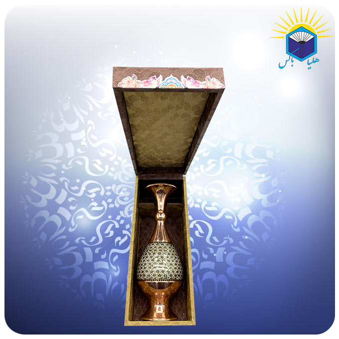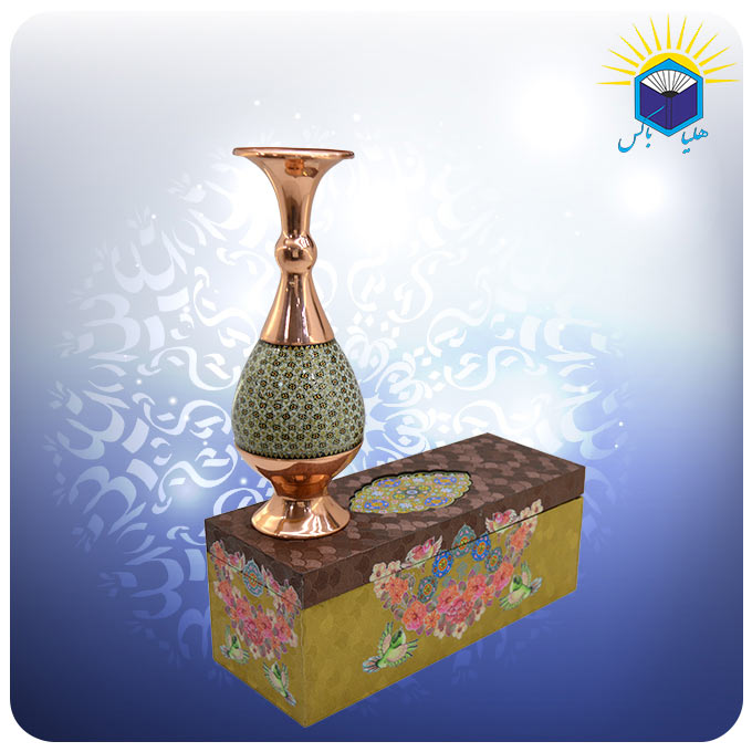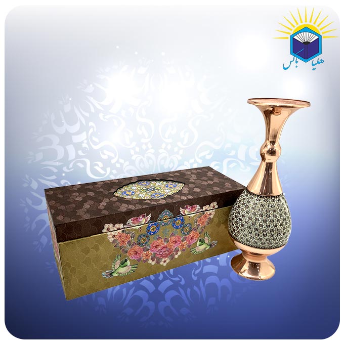 صنايع دستی اصفهان در طول قرنهای متمادی بهعنوان نماينده هنر اصيل قوم ايرانی در جهان معرفی شدهاند و یکی از بهترین سوغاتیهای این شهر به شمار میآیند. مس و خاتم یکی از صنایع دستی نسبتا جدید اصفهان است که از تلفیق هنر مسگری و خاتم سازی به وجود آمده است. در خاتم کاری از چوب و استخوان استفاده میشود و تمام سطح جسم موردنظر را با نقوش هندسی پر میکنند. برای خاتم کاری روی مس در ابتدا ظرف مسی موردنظر توسط استاد مسگر آماده شده و سپس بخشهایی از آن با قطعات خاتم کاری پوشانده میشود. این گلدان صراحی مس و خاتم کاری ۲۵ سانت دارای جعبه هدیه از جنس ام دی اف و گالینگور به وزن ۹۸۰ گرم است. ابعاد داخلی جعبه ۲۷ * ۱۰ * ۹.۵ میباشد.