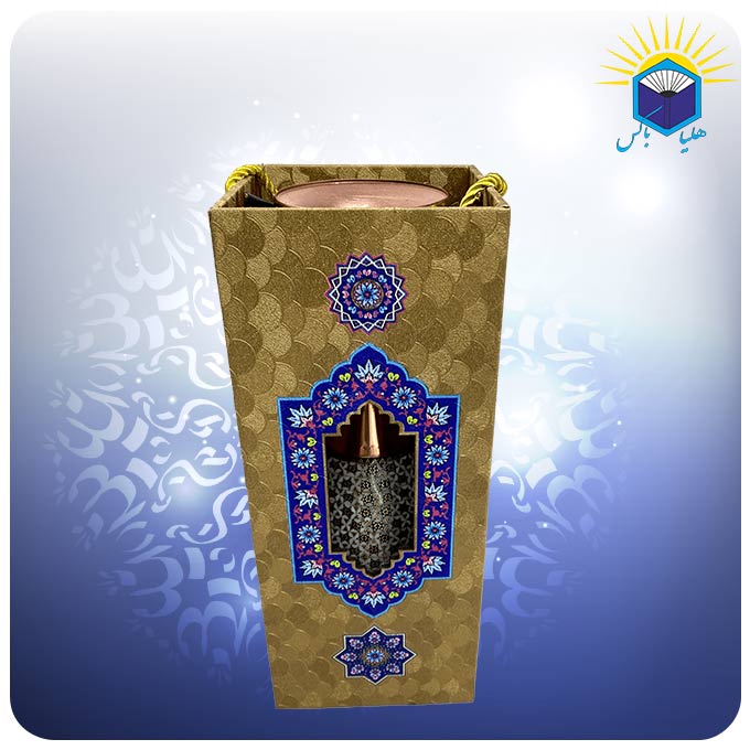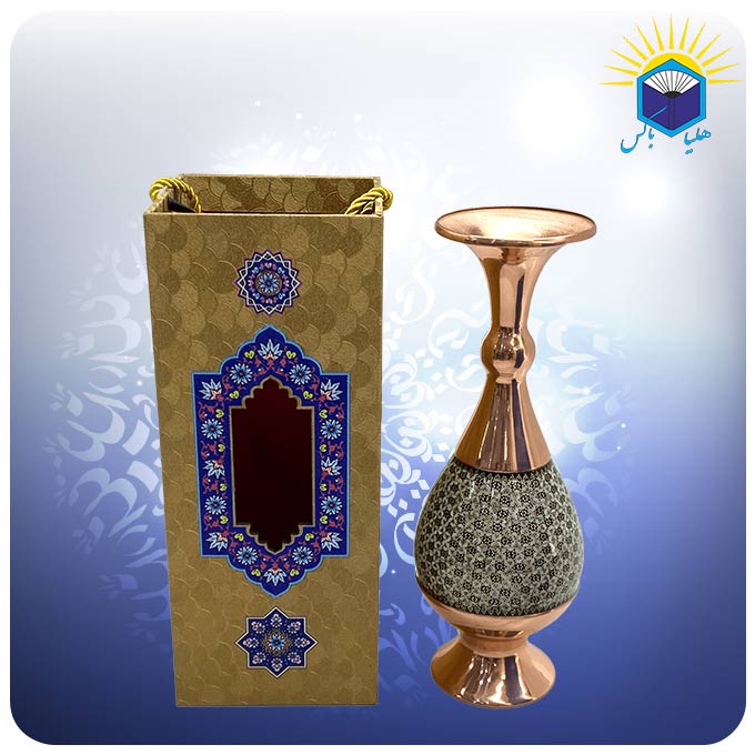 صنايع دستی اصفهان در طول قرنهای متمادی بهعنوان نماينده هنر اصيل قوم ايرانی در جهان معرفی شدهاند و یکی از بهترین سوغاتیهای این شهر به شمار میآیند. مس و خاتم یکی از صنایع دستی نسبتا جدید اصفهان است که از تلفیق هنر مسگری و خاتم سازی به وجود آمده است. در خاتم کاری از چوب و استخوان استفاده میشود و تمام سطح جسم موردنظر را با نقوش هندسی پر میکنند. برای خاتم کاری روی مس در ابتدا ظرف مسی موردنظر توسط استاد مسگر آماده شده و سپس بخشهایی از آن با قطعات خاتم کاری پوشانده میشود. این گلدان صراحی مس و خاتم کاری ۲۵ سانت دارای ساک دستی از جنس ام دی اف و گالینگور به وزن ۰.۶۲ کیلوگرم است. ابعاد ساک دستی ۲۶ * ۱۰.۵ * ۱۰.۵ میباشد.
